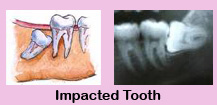 These are third molars, four in number, one on either side of jaw, erupt between 17 to 21 years of age. One, two or all the four wisdom teeth may be missing. Sometimes a wisdom tooth may be partially erupted or may not erupt at all, such a tooth is called impacted tooth. |